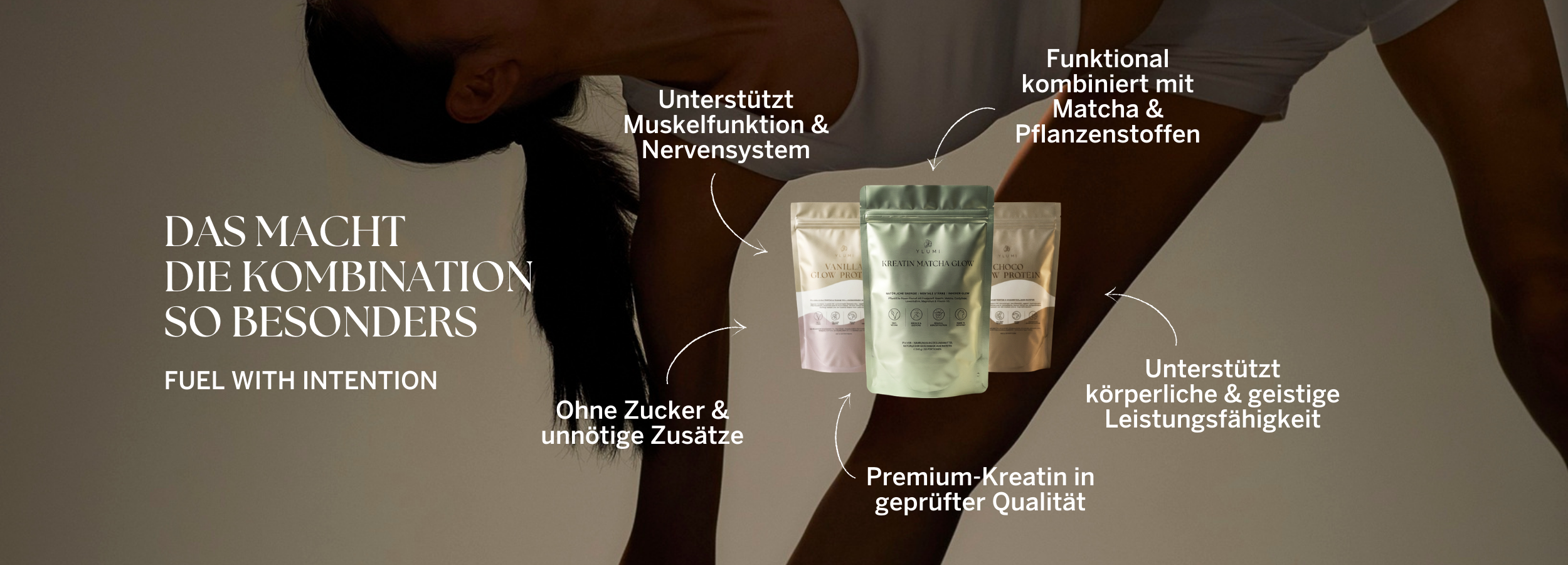 Maximale Performance trifft auf gezielte Regeneration – mit KREATIN MATCHA GLOW + GLOW PROTEIN holst Du das Beste aus Deinem Tag heraus.