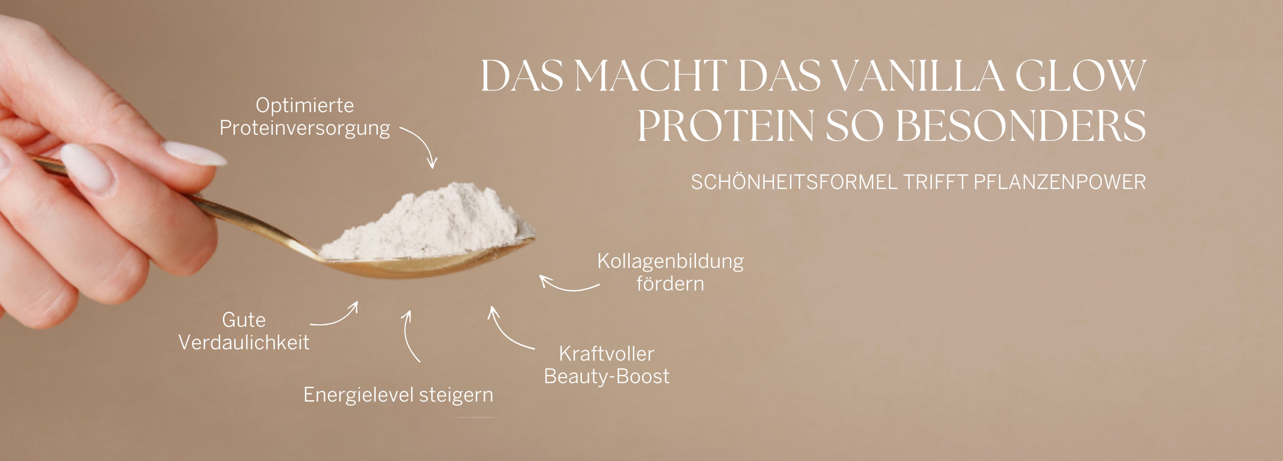 Die einzigartige Formel des VANILLA GLOW PROTEINS kombiniert ideal aufeinander abgestimmte pflanzliche Proteinquellen, essentielle Aminosäuren und vegane Hyaluronsäure. Sie unterstützt die natürliche Kollagenbildung und trägt zum Erhalt gesunder Haut, kräftiger Haare und starker Nägel bei. Gleichzeitig sorgt sie für eine optimale Proteinversorgung Deines Körpers.